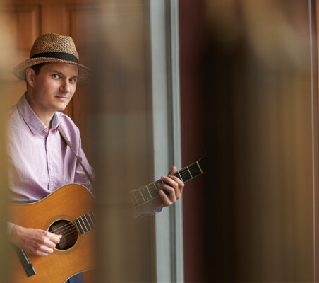 A singer-songwriter who can surprise, entertain and make you sing. A collector who likes to translate masters. In the summer he loves the wind and movement, so he goes on a bike tour. In the winter he seeks shelter and peace, so he broadcasts online from his attic.
